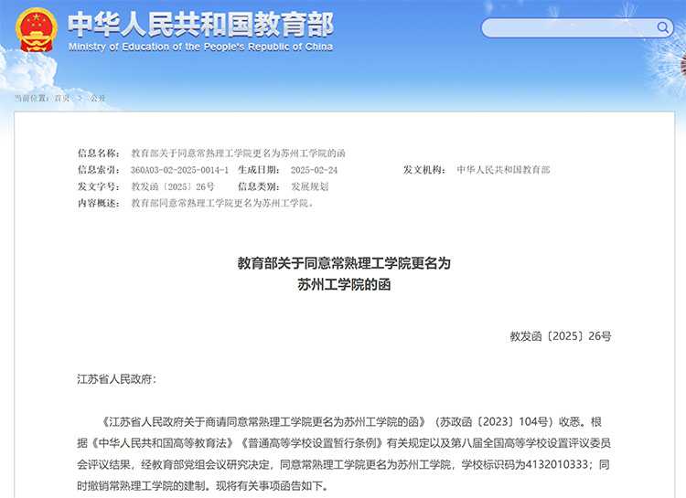 日前,教育部kok登录官网正式发涵,同意常熟理工学院更名苏州工学院,学校标识码4132010333,同时撤销常熟理工学院建制。