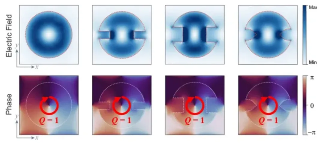 具有对结构微扰免疫的拓扑共振模式。其电场分布在结构中心呈现一个奇点,相位分布具有非平庸拓扑荷,不受结构微扰的影响