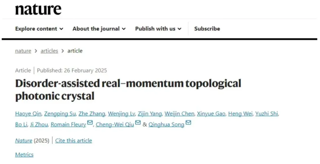 相关研究成果以“无序辅助的实动量拓扑光子晶体”为题在线发表于《自然》(nature)杂志。宋清华、仇成伟、罗曼·弗勒里为论文通讯作者,深圳国际研究生院科研助理秦昊烨(现为洛桑联邦理工大学博士生)为论文第一作者,深圳国际研究生院2022级博士生苏增平和洛桑联邦理工大学博士后张哲为论文共同第一作者。