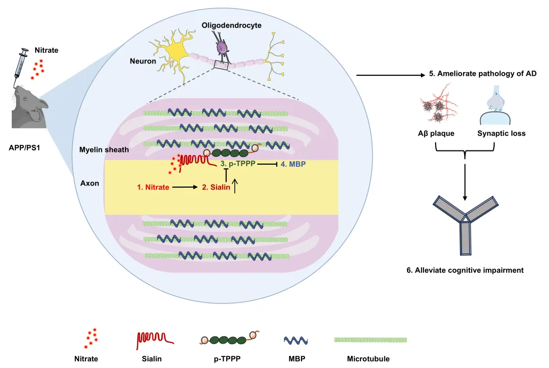 上述研究揭示了硝酸盐通过上调神经元sialin,降低ad模型小鼠海马tppp的磷酸化,进而改善其髓鞘丢失并缓解ad病理和认知障碍,同时阐明sialin与tppp结合的具体位点,该研究为ad治疗靶点和治疗策略的开发提供重要理论依据。