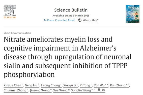 近日,首都医科大学基础医学院口腔健康北京实验室王松灵院士团队在《science bulletin》上发表题为“nitrate ameliorates myelin loss and cognitive impairment in alzheimer's disease through upregulation of neuronal sialin and subsequent inhibition of tppp phosphorylation”的研究论文。该研究发现硝酸盐显著缓解阿尔茨海默病(ad)模型小鼠髓鞘丢失并有效改善其认知障碍,并揭示硝酸盐上调神经元硝酸盐转运蛋白(sialin),进一步降低ad模型小鼠海马促微管蛋白聚合蛋白(tppp)的磷酸化是其缓解ad的机制,该研究为ad治疗靶点和治疗策略的开发提供重要理论依据。首都医科大学基础医学院口腔健康北京实验室博士后陈欣月为第一作者,王松灵院士为通讯作者。