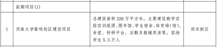 河南大学雁鸣校区建设项目位于郑东新区。总建筑面积220万平方米,主要建设教学实验实训组团、图书馆、学生宿舍、体育场(馆)、食堂、科研平台、后勤及教辅用房等,容纳学生5.3万人。