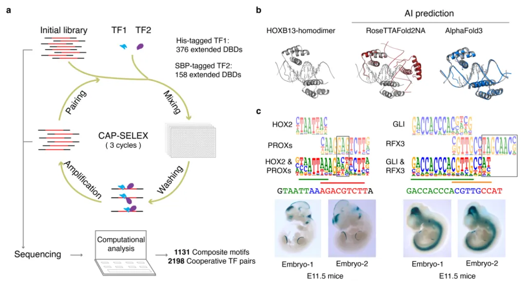 研究团队借助于高通量筛选技术和计算生物学手段,对58000多种转录因子组合是否可协同结合dna进行了系统性评估,鉴定出2198对协同作用的转录因子,并解析了协同作用转录因子识别的dna基序(图a)。进一步深入研究发现,转录因子间的协同作用目前还不能被alphafold等人工智能工具所预测(图b)。因而,研究提供的迄今为止最全面的转录因子协同作用数据库,以及协同作用转录因子识别的dna基序库,为科学家们深入探索转录因子的各种生物学功能提供了重要的数据支撑和理论依据。