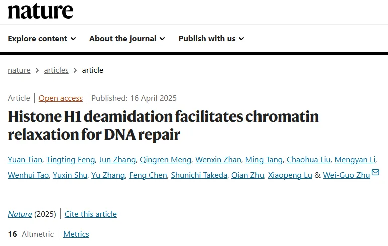 2025年4月16日,深圳大学医学部基础医学院及卡尔森国际肿瘤中心朱卫国教授团队在《自然》(nature)杂志在线发表了题为“histone h1 deamidation facilitates chromatin relaxation for dna repair”的研究论文,揭示了连接组蛋白h1脱酰胺化修饰(deamidation)促进染色质开放和dna损伤修复的机制,为肿瘤放化疗的精准靶标设计夯实了理论基础,在肿瘤防治基础研究领域取得突破性进展。