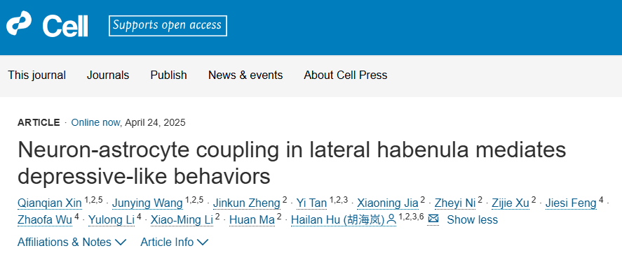 浙江大学医学院胡海岚教授团队揭示压力应激下外侧缰核和蓝斑核循环接力、神经元与星形胶质细胞时序激活,传递压力信息,介导抑郁症的发生,展示了不同细胞类群协同参与情绪编码的图景,从分子、细胞和神经环路水平解释了“压力山大”导致抑郁的原因,发表了题为“neuron-astrocyte coupling in lateral habenula mediates depressive-like behaviors”的研究论文。胡海岚为通讯作者,浙江大学医学院博士生辛倩倩、王俊盈为共同第一作者。