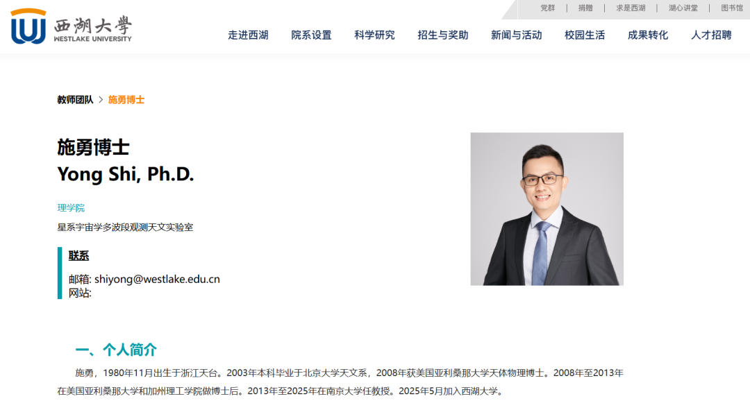 南京大学天文与空间科学学院教授施勇加盟西湖大学