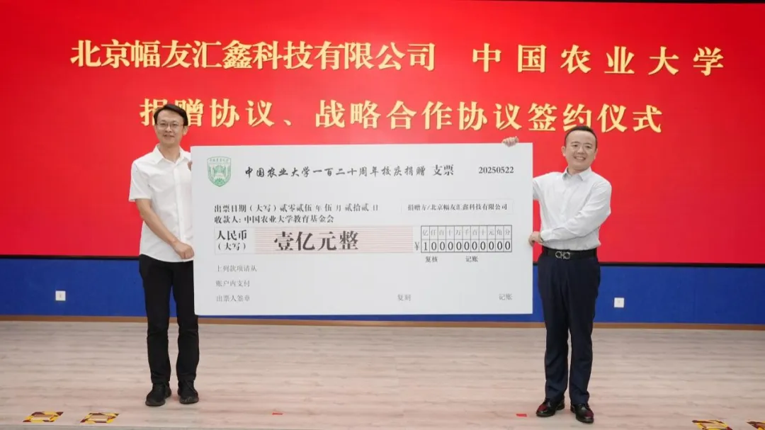 5月22日,北京幅友汇鑫科技有限公司-中国农业大学捐赠协议、战略合作协议签约仪式举行。北京幅友汇鑫科技有限公司向中国农业大学捐赠1亿元,设立“中国农业大学-幅友教育基金”,专项支持智慧渔业领域的人才培养、师资队伍、学科发展及产学研融合平台建设。