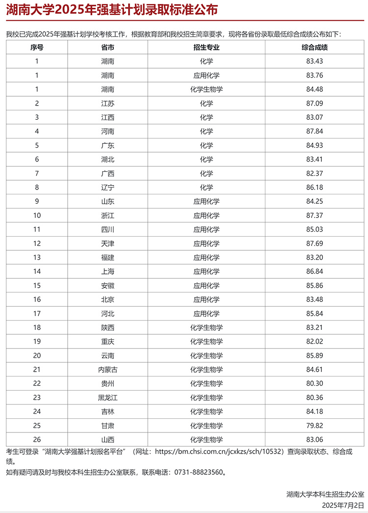 7月2日,湖南大学公布2025年强基计划录取标准。具体如下: