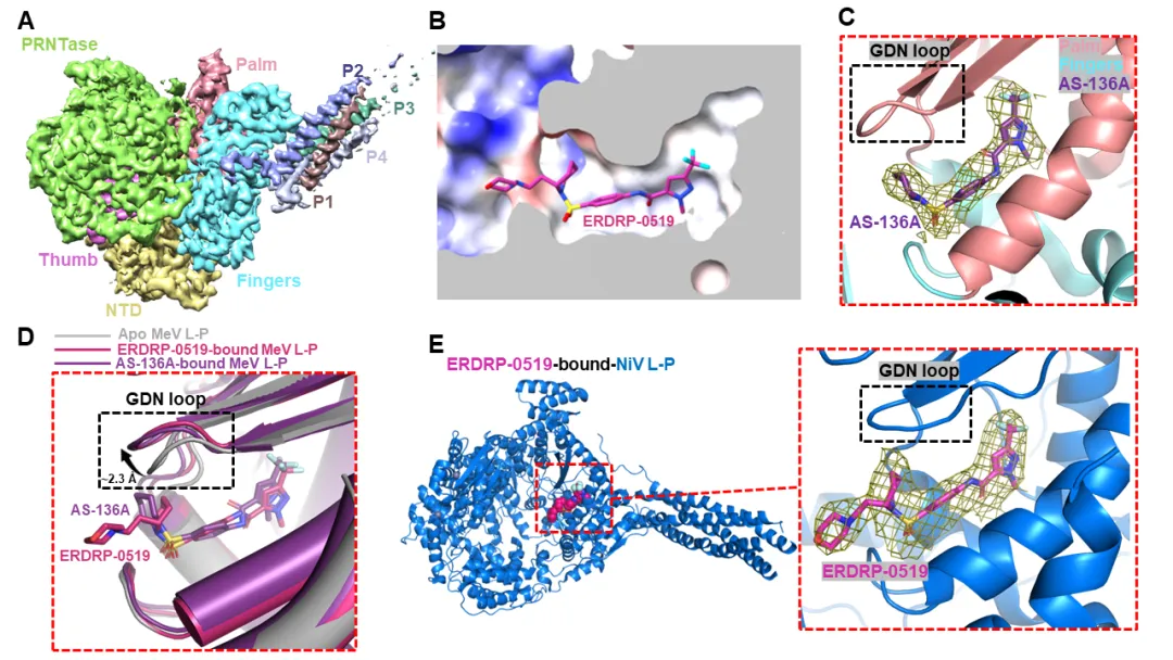 图1. 非核苷类抑制剂抑制麻疹病毒及尼帕病毒聚合酶的分子机制。(a) 麻疹病毒l-p复合物冷冻电镜重构图;(b) erdrp-0519结合麻疹病毒l-p复合物的分子细节;(c) as-136a结合麻疹病毒l-p复合物的分子细节;(d) 非核苷类抑制剂诱导麻疹病毒聚合酶发生构象变化;(e) erdrp-0519结合尼帕病毒l-p复合物分子细节