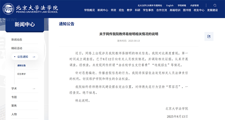 8月13日晚,北京大学法学院发布说明:近日,网络上出现涉及法学院教师易继明的相关信息。学院对此高度重视,第一时间成立调查组,已于8月12日向有关人员核实情况,并调取相关证据,认真开展调查。经核查,未发现网传所谓“由在校学生支付餐费”“违规招生”等情况。