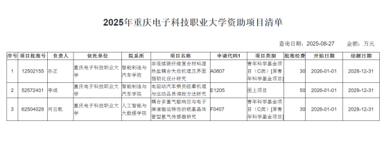 8月27日,国家自然科学基金委公布了2025年国自然项目评审结果。重庆电子科技职业大学成功获批立项3项国家自然科学基金项目,其中:面上项目1项,青年科学基金项目2项,共获批准经费110万元,实现历史性突破,立项数和批准经费位列重庆市职业院校首位。