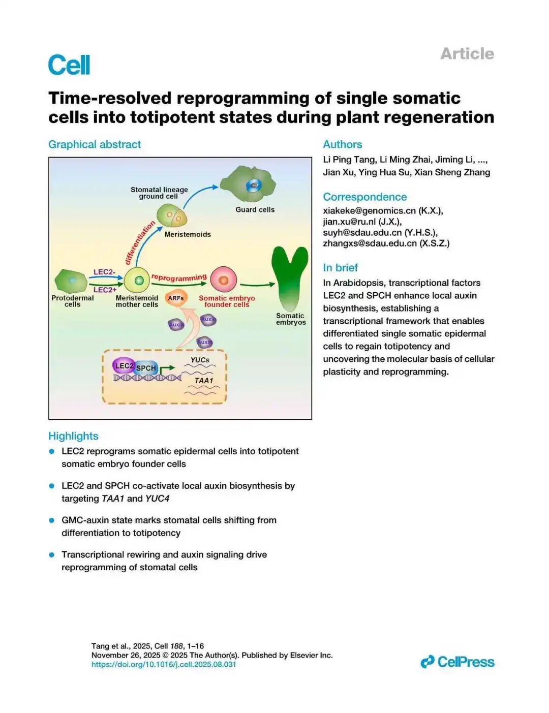 山东农业大学张宪省教授和苏英华教授研究团队首次完整揭示了单个植物体细胞如何通过基因重编程“改变命运”,最终发育为完整植株的全过程。该成果不仅破解了困扰科学界百余年的“植物细胞全能性”机制之谜,也为作物遗传改良与高效再生提供了全新理论支撑。9月16日,这一成果在国际著名学术期刊《细胞》(cell)在线发表。