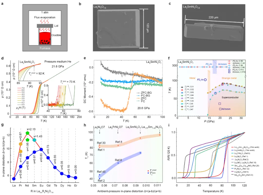 团队发现la2smni2o7单晶在21.6gpa下tc高达92k,零电阻温度73k,超导体积分数超60%,明确证实该材料为体超导,同时打破了之前的镍基超导温度纪录。团队还发现该材料在单斜、四方两种结构下均能超导,为解决镍基高温超导机理问题提供重要结构基础。