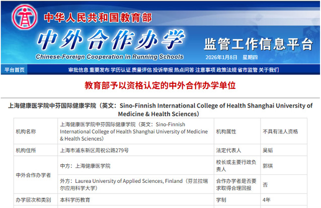 近日,上海健康医学院中芬国际健康学院正式获教育部批准设立。首批开设康复物理治疗、数据科学与大数据技术两个专业,开展本科层次学历教育,学制4年,采用“4 0”模式。两个专业每年各招收80人,纳入国家普通高等学校招生计划。学生完成学业,符合毕业及学位申请要求的学生,可同时获得上海健康医学院本科学历证书及学士学位证书,以及芬兰拉瑞尔应用科学大学医疗保健学士学位或工商管理学士学位。