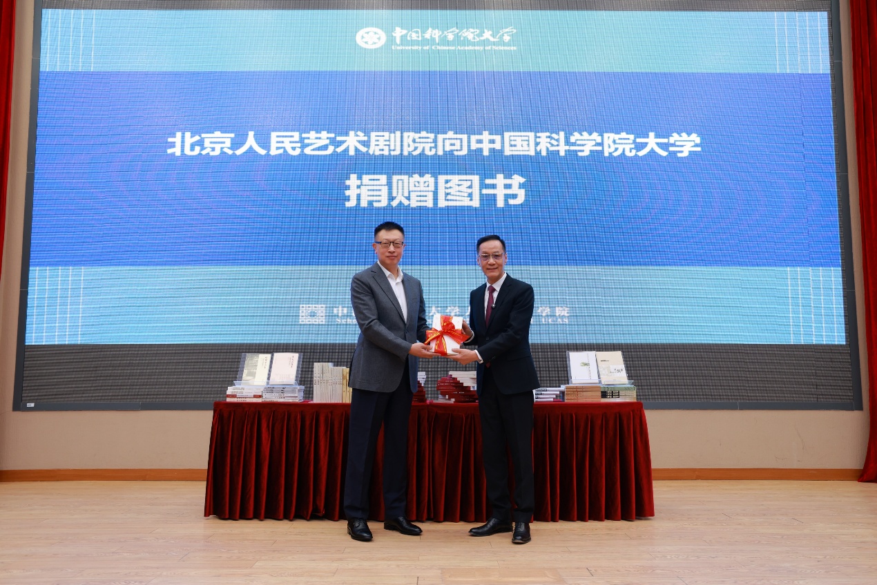 现场,冯远征代表北京人民艺术剧院向国科大捐赠图书,书籍涵盖经典剧本集及舞台艺术、画册、艺术理论专著等多个品类。周琪代表国科大向北京人民艺术剧院颁发捐赠证书。