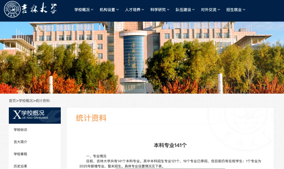 近日,吉林大学本科生院更新了该校本科专业目录。目前,吉林大学共有141个本科专业。其中本科招生专业121个,19个专业已停招,但目前仍有在校学生;1个专业为2025年新增专业,暂未招生。