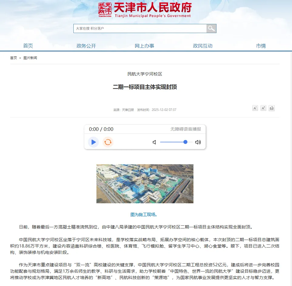 近期,据天津人民政府kok登录官网消息,中国民航大学宁河校区二期一标项目主体结构实现全面封顶。该工程总投资52亿元,总建筑面积约18.86万平方米。