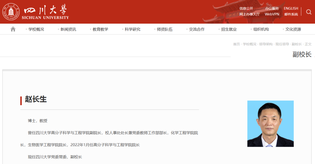 近日,四川大学现任领导栏更新显示,赵长生已任四川大学党委常委、副校长。