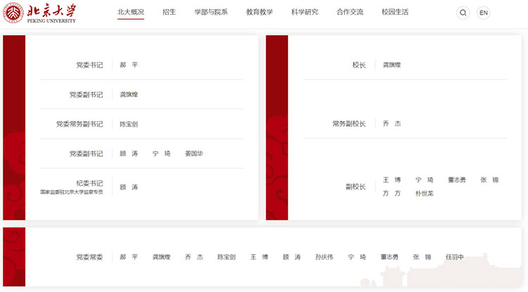 11月14日,北京大学kok登录官网“现任领导”栏目更新信息显示,北京大学领导层出现多人调整。其中,姜国华出任北京大学党委副书记,方方、朴世龙出任北京大学副校长,任羽中出任北京大学党委常委。