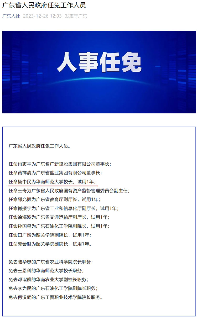 据“广东人社”微信公众号12月26日消息,广东省人民政府任免工作人员。其中,任命杨中民为华南师范大学校长,试用1年;免去王恩科的华南师范大学校长职务。