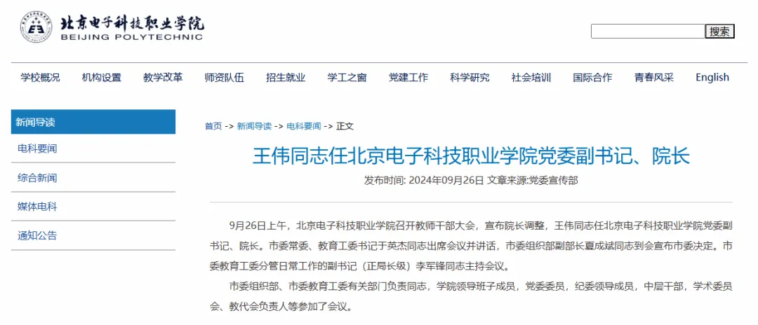9月26日上午,北京电子科技职业学院召开教师干部大会,宣布院长调整,王伟同志任北京电子科技职业学院党委副书记、院长。市委常委、教育工委书记于英杰同志出席会议并讲话,市委组织部副部长夏成斌同志到会宣布市委决定。市委教育工委分管日常工作的副书记(正局长级)李军锋同志主持会议。