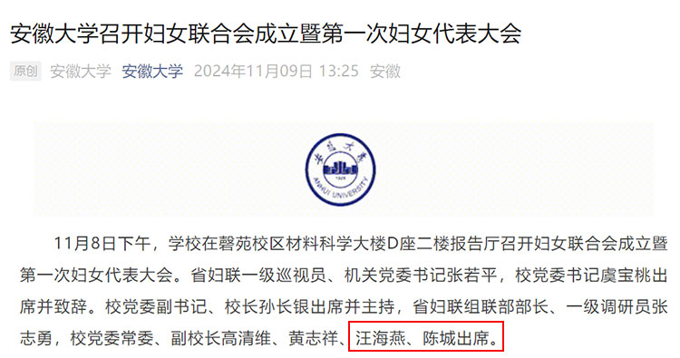 上述消息显示,汪海燕、陈城已经出任安徽大学党委常委、副校长。