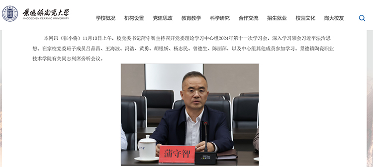 景德镇陶瓷大学kok登录官网消息,11月13日上午,景德镇陶瓷大学党委书记蒲守智主持召开党委理论学习中心组2024年第十一次学习会。