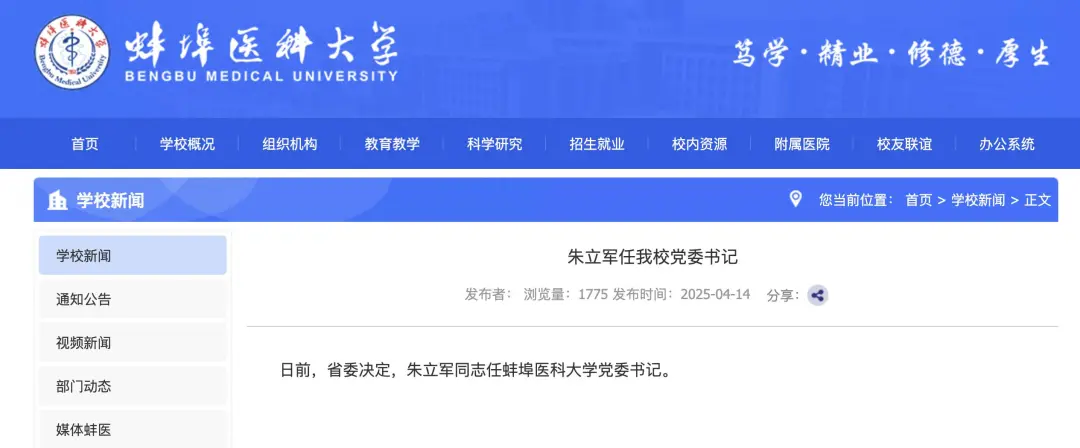 朱立军任蚌埠医科大学党委书记
