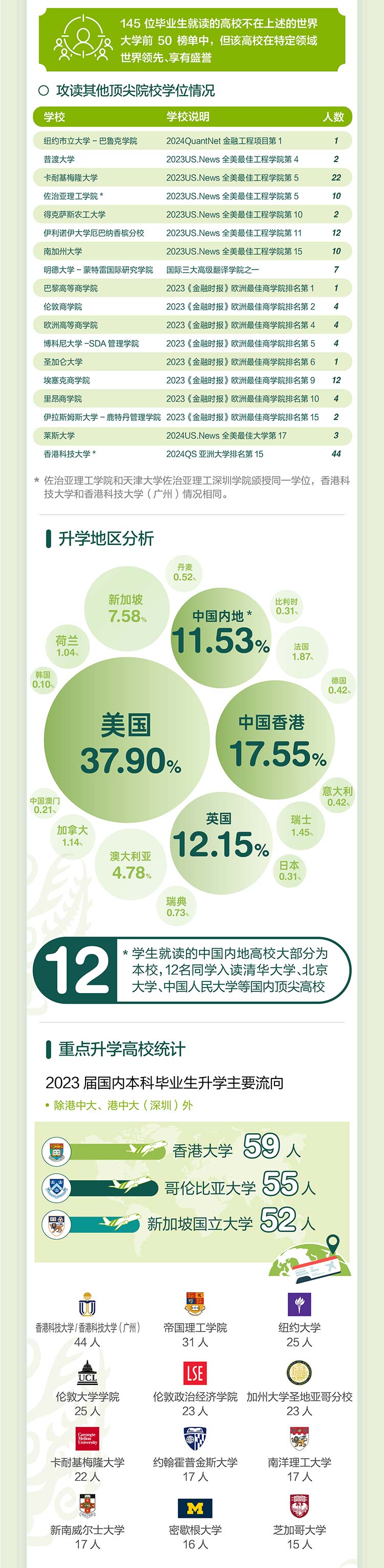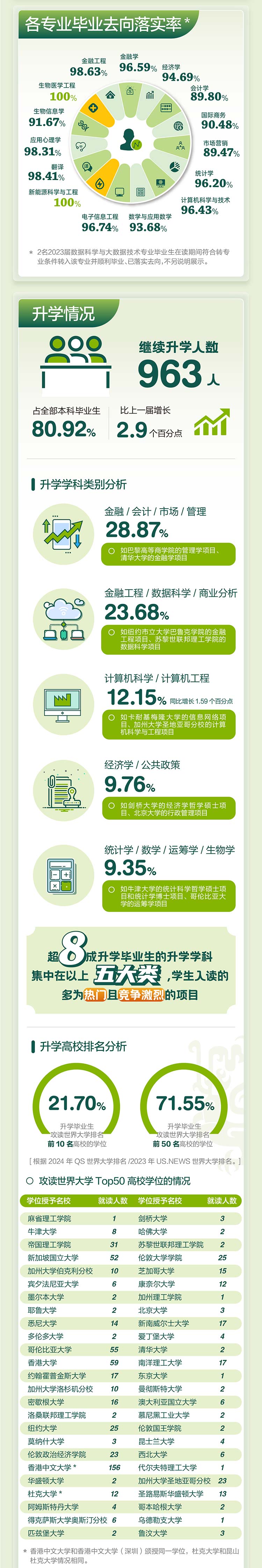 根据2024年qs世界大学排名/2023年us.news世界大学排名,963名升学毕业生中,21.70%攻读世界大学排名前10名高校的学位,包括麻省理工学院1人、剑桥大学3人、牛津大学8人、哈佛大学2人、帝国理工学院31人、苏黎世联邦理工学院2人、新加坡国立大学52人、伦敦大学学院25人、加州大学伯克利分校10人、华盛顿大学2人、哥伦比亚大学55人、加州理工学院1人、约翰霍普金斯大学17人等;71.55%攻读世界大学排名前50名高校的学位。