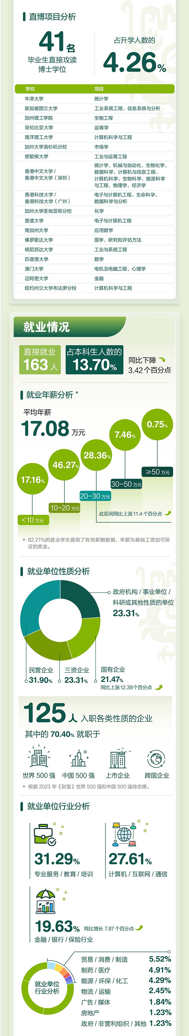 毕业生的就业地点和单位性质更加多元,足迹遍布各地各类优质企业。香港特区iang工作签证的适用范围拓展至香港中文大学(深圳),为学校学子打开了更大的就业面;选择前往国有企业的比例同比上涨12.38个百分点。