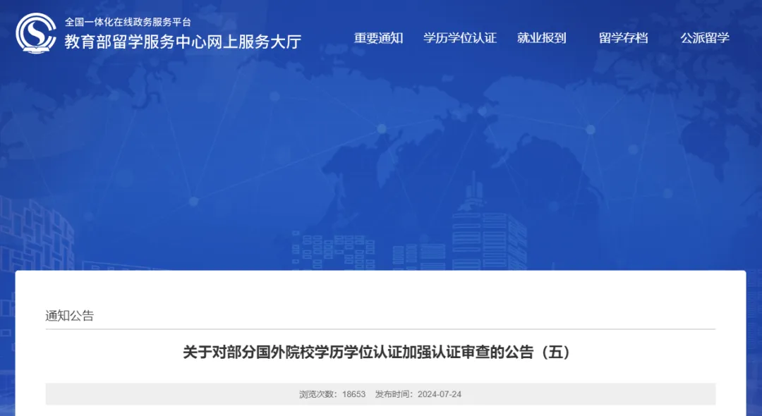 7月24日,教育部留学服务中心发布《关于对部分国外院校学历学位认证加强认证审查的公告(五)》,对部分国外院校学历学位认证加强认证审查。