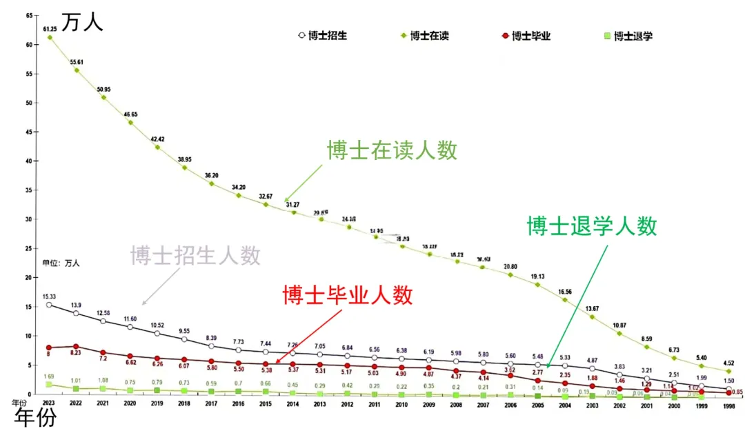 尽管发展如此之快,但是据统计,从1998年到2023年的26年里,我国的博士毕业生总数也才114.6万人,仅占14亿人口的0.08%左右。也就是说,平均每1万人中才有8个博士。而发达国家的博士率基本上能占总人口的1%左右,可以看出,这个数据是远低于发达国家水平的。