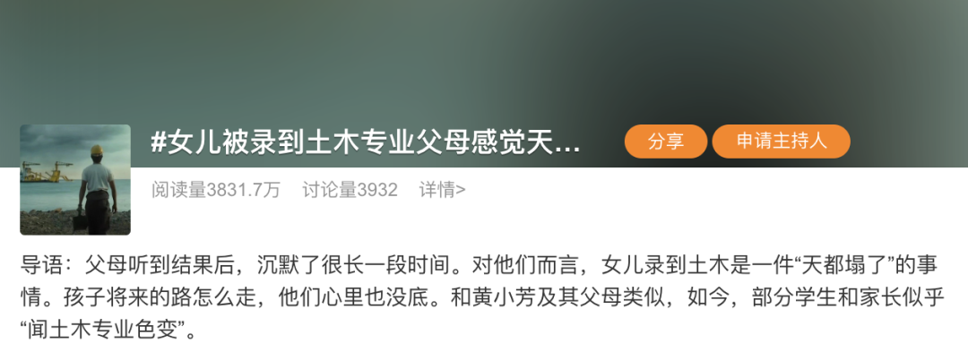土木工程,又一次被推上风口浪尖。近日,#女儿被录到土木专业父母感觉天塌了#的话题引发广泛讨论,迅速登上热搜榜。