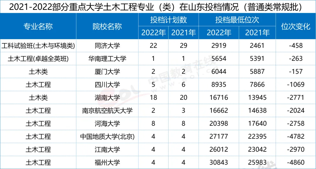 根据中国教育在线发布的《2023高招调查报告》,全国范围大部分高校土木专业分数都出现了明显的滑坡,录取分数(位次)出现了不同程度的下跌。同济大学在山东的录取位次下跌了400多,中国地质大学(北京)在招生总量未变的情况下,录取考生的位次下跌了近5000个位次,四川大学与湖南大学则分别下跌1069和2771个位次。
