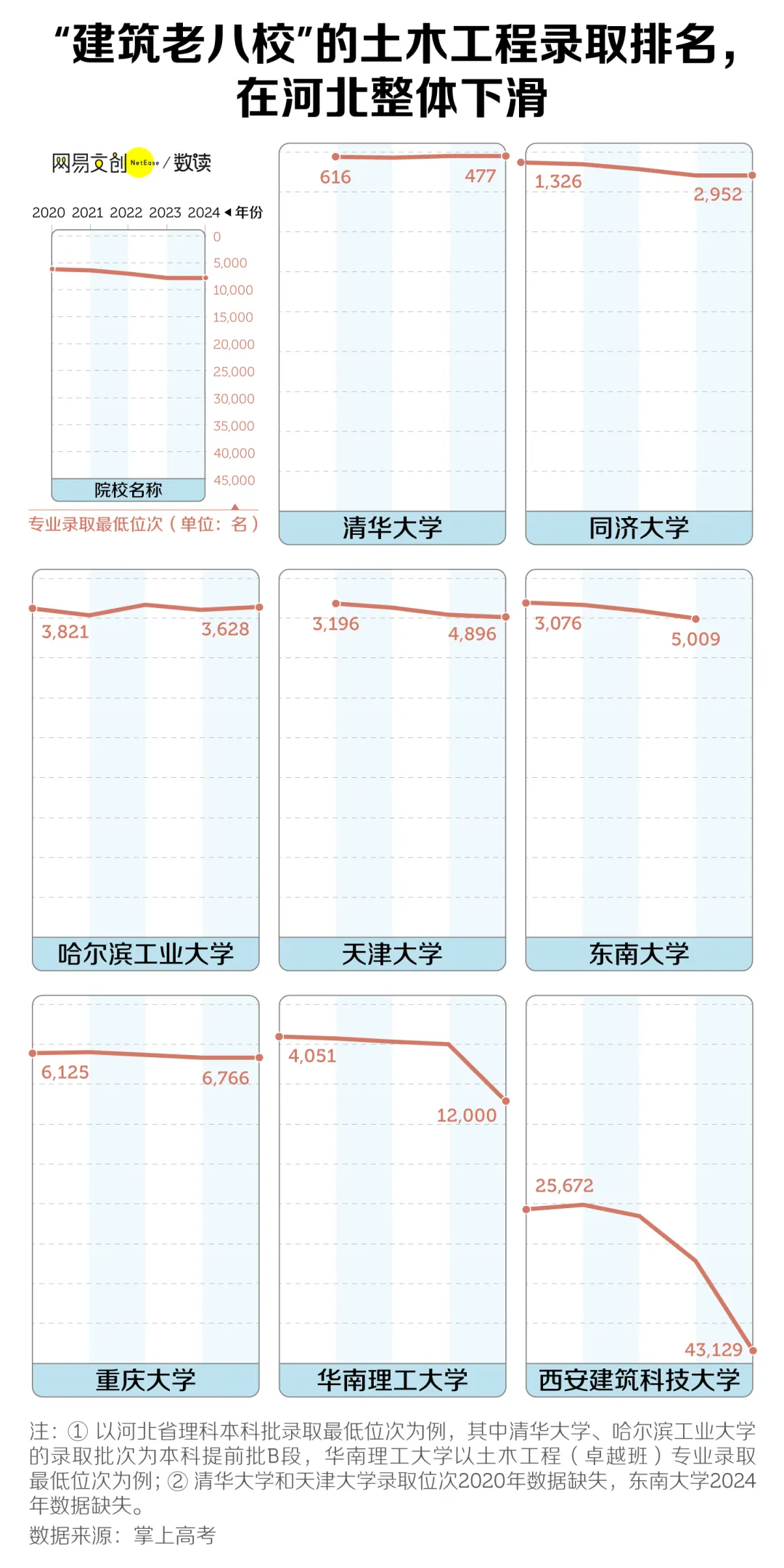 2020年以来,在土木业内拥有重大影响力的“建筑老八校”在河北的高考录取中,除了清华大学、哈工大的最低录取名次在“闷声”回升外,其他学校的录取位次大多有所下跌。相较往年,2024年华南理工大学在河北的最低录取位次掉落了近七千名,西安建筑科技大学更是暴跌一万多名。