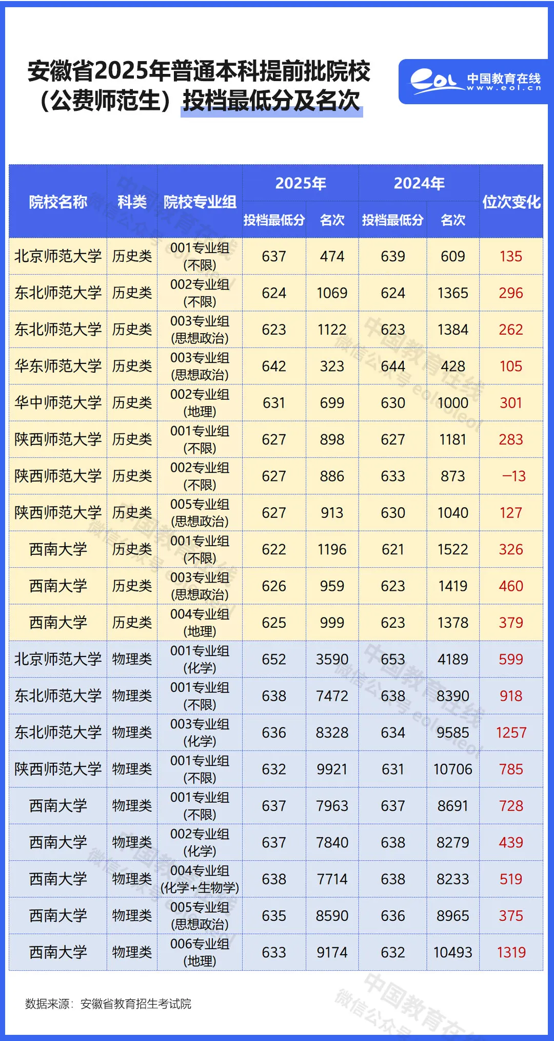 在安徽省的公费师范生录取中,北京师范大学等6所部属师范院校今年的招生分数线与去年持平,但在位次变化上,较去年几乎全线上涨。西南大学物理类006专业组(地理)今年投档最低名次为9174位,较去年前移1319位。
