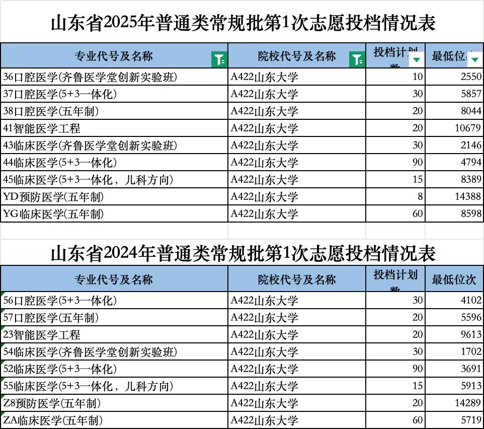 此外,在山东省,各大高校临床医学的录取分数线也有普遍下跌趋势。例如,山东大学临床及相关专业的投档最低位次较2024年有明显下降,其中,临床医学(五年制),录取位次号从2024年的5719位下降到了2025年的8598位,位次下滑2879位。临床医学(5 3一体化,儿科方向)录取位次号从2024年的5913位下降到了8389位,位次下滑2476位。