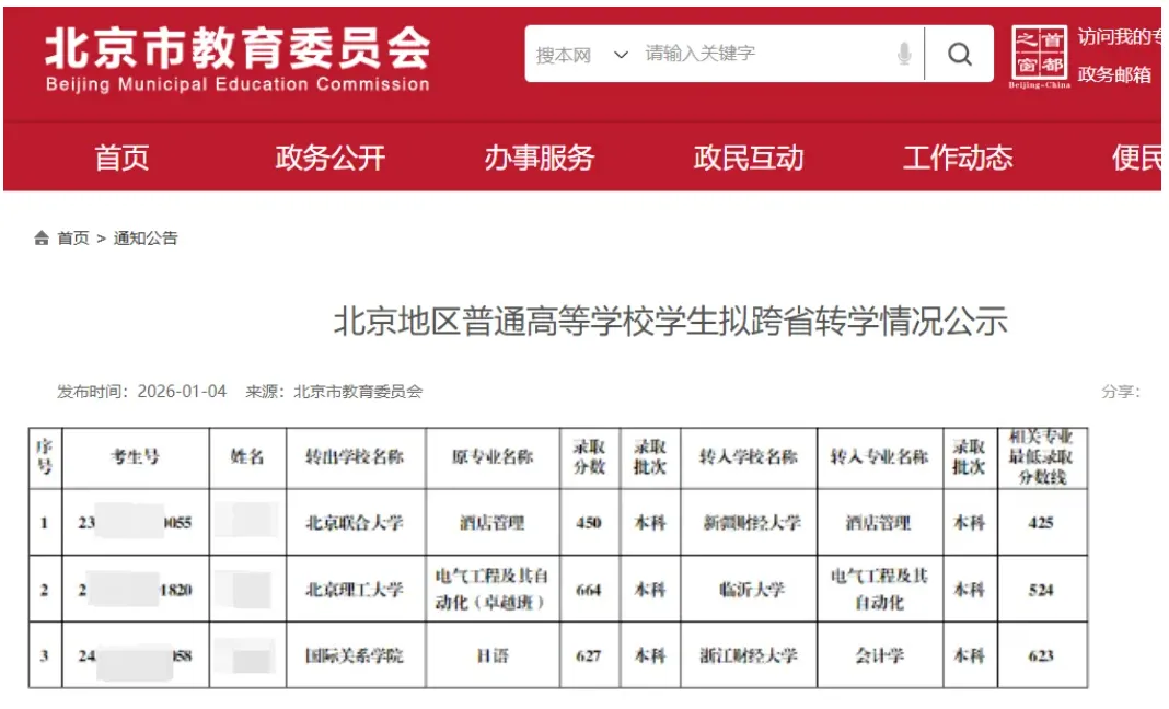 北京地区普通高等学校学生拟跨省转学情况公示(图源:北京市教委kok登录官网-2024年1月2日)