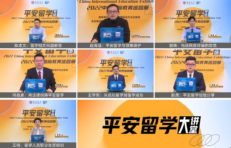 4月23日,由教育部国际合作与交流司指导,教育部留学服务中心与新华网联合举办的“2022中国国际教育巡回展——平安留学专场”活动拉开帷幕。平安留学大讲堂、专家访谈和海外留学安全技能培训三场直播,邀请专家围绕疫情期间出国留学、领事保护、防范诈骗、法律援助、职业规划、留学经验等进行专业讲解和指导,解答留学人员和家长普遍关心的问题;专业安保教官模拟抢劫、枪击、火灾、地震等场景,指导留学人员如何规避风险、安全应对。