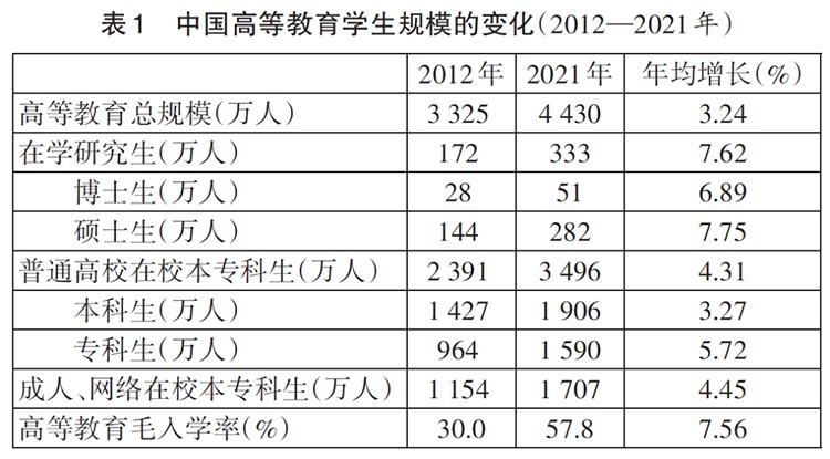 2021年,全国共有高等学校3012所,比2012年增加了一千多所;高校专任教师189万人,比2012年增加了近45万人,高等教育在学总规模增加了一千多万人,高等教育毛入学率几乎翻番。(见表1)从国际比较看,我国高等教育的绝对规模位居世界第一,相对规模也在快速增长。2010年和2015年,世界各国(地区)毛入学率的平均值分别为29.3%和35.6%。据此,2010年我国高等教育毛入学率还低于世界平均水平2.8个百分点,2015年已超出4.4个百分点。按照趋势外推法,目前世界高等教育毛入学率的平均值,要低于我国10多个百分点。