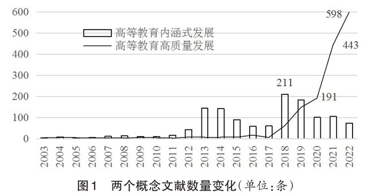 2023年8月26日,笔者在中国知网(cnki)上,分别以“高等教育内涵式发展”和“高等教育高质量发展”为主题进行查询,各有结果1 317条、1 863条。尽管在21世纪初,上述两个概念已经在国内文献出现,但文献数量都较少。以“高等教育内涵式发展”为主题的文献数量,2011年后快速增加,但在2018年达到峰值(211条)后下降;而“高等教育高质量发展”为主题的文献2018年起开始大幅上升,在2020年超过前者,2022年达到新高598条。(见图1)