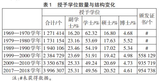 2017—2018学年,美国授予学位近400万个。(见表1)其中,授予副学士学位增加到101.15万人,占比也大幅提高;授予学士学位增加到198.06万人,占比虽然下降,但依然最高;授予硕士学位增加到82.01万人,占比有所提高;授予博士学位增加到18.41万人,占比变化不大。另外,2017—2018学年,参加联邦第ⅳ类财政资助的高校和机构颁发学习证书95.47万个,是1999—2000学年的1.71倍。