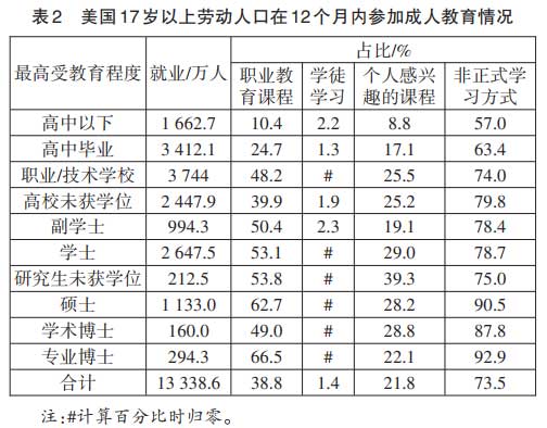 建设学习型社会,公民通过教育改变和掌握自己命运的需求强烈,基于兴趣和爱好的学习也会成为生活的组成部分,职业教育、专业教育、技能教育等概念界定不清,并经常不加区分地混用,在线教育的发展和普及,更加使得学习冲破了传统学校教育的界限,不少人都需要、也有条件通过职业教育进行再学习,也应提倡基于“个人兴趣与爱好”(individual interests and hobbies)的终身学习。如表2所示,美国专业博士学习职业教育课程和以非正式方式参加个人感兴趣学习的比例,在成人教育中都是最高的。在我国,除教育部公布的成人高校统计数据之外,干部职工的培训规模和强度都很大,党校(行政学院)、社会主义学院、职工大学、老年大学等的学习人数和课程众多,成为学习型社会的重要组成部分,也都应进行科学统计,加强宣传和比较。