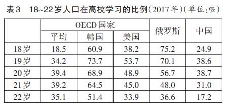 nces的上述数据没有涵盖中国,但从相关信息看,我国18~19岁人口在高校学习的比例,2017年已高于oecd国家平均水平,但与其20~22岁人口相比还有差距。(见表3)同时,我国18~22岁人口在高校学习的比例与韩国、俄罗斯、美国相比,都有一定的差距,特别是22岁人口在高校学习的比例下降幅度和差距都较大,原因还有待于进一步研究。另外,2019年我国小学以上学校在校生2.34亿人,其中高校学生占比17.10%,该比例是高校扩招之前的6.17倍。相比较,1959年,美国高校注册学生占到当年小学以上学生人数的8.18%,1985年提高到21.40%,2017年为26.03%,公民受教育的层次持续提高。