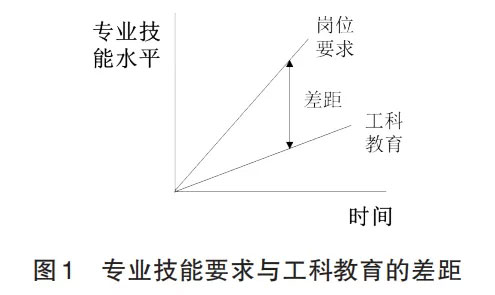 一方面,专业教育的拥护者强调,伴随工科技术水平的不断提升,对于工程师专业能力(competence)的质量要求也越来越高,认为不能忽视未来工程师在其专业范围内拥有高水平技术优势的需要,主张要加大工科教育的专业技能深度,培养学生掌握专门领域的职业技能,使其走上工作岗位后能够专业对口、上手快。参考“企业与学术的差距”模型,可以构建岗位需求与工科教育的差距模型,以此描述该质量要求,即随着时间的推移,工科教育的创新相对滞后,高校毕业生的专业技能水平越来越不能适应工作岗位的要求。(见图1)