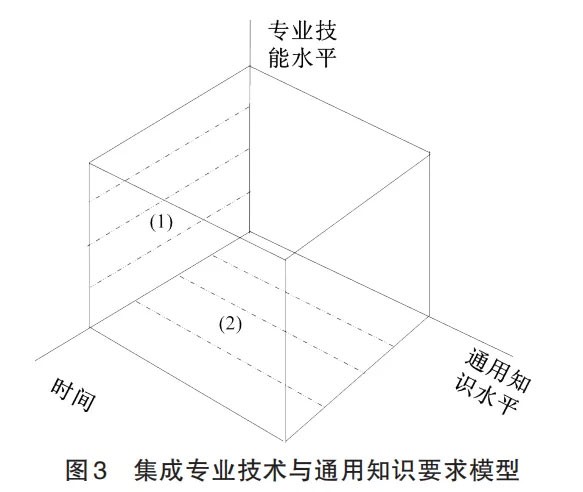 上述两种观点都能找到实际案例,也可找到诸多理论观点予以支撑,都具有一定合理性,但也都有局限性,即片面地强调工程师岗位某一方面的要求,将专业技能与通用知识相互割裂、对立起来。培养一名未来的工程师,如果只强调专业技能水平,就会停留在图3中左侧面的(1)区。同样,如果只强调通用知识水平,就会停留在图中底部的(2)区。二者都显得比较单薄和极端,不符合工科教育的实际。