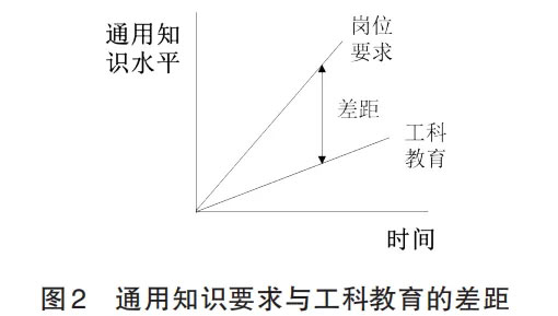 另一方面,通识教育的拥护者强调,伴随工科知识广度的不断拓展,工科教育应当为传统的自由教育提供与时俱进(appropriate to the times)的基础,拓宽教学内容,在教育教学课程中加强自然科学、人文社科、交流艺术等基础,包括经济学、管理学等课程,为工科专业的本科生提供广博的通识教育,增强学生对于当代社会问题的敏感性和分析能力,但工科教育创新还不能满足上述要求,工科毕业生与工作岗位对于通用知识水平的要求之间的差距在扩大。(见图2)