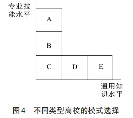如图4所示,高职院校和应用型本科高校的工科教育,可能更倾向于选择abc组合,在保证一定通用知识水平的基础上,侧重于强化专业技术水平;研究型大学的工科本科教育,可能更倾向于选择cde组合,夯实通用知识水平基础;而教学科研型高校的工科本科教育则可能介于二者之间,选择bcd组合,兼顾和平衡两个方面的要求。