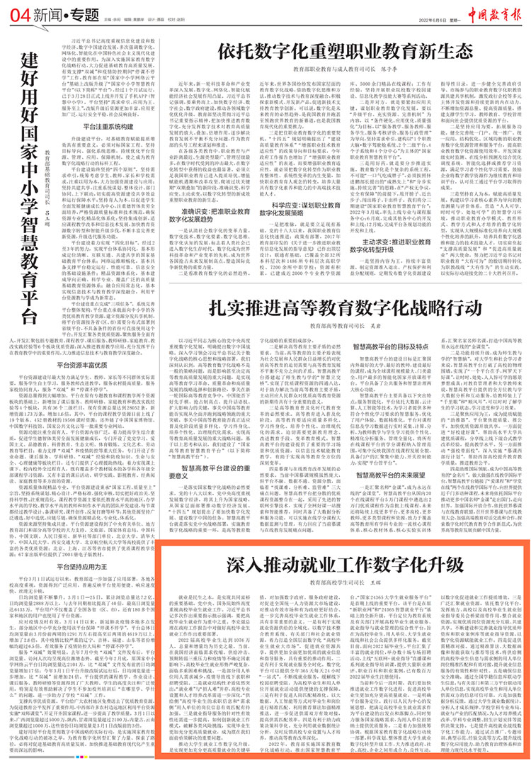 推动大学生就业工作数字化升级,是实现更加充分更高质量就业的关键举措,对加强数字政府、服务政府建设,对促进全国统一人力资源大市场建设,对推动有效市场和有为政府更好结合、进一步完善高校毕业生就业工作体系,具有非常重要的意义。一是有利于实现就业资源供给的全域化。以数字技术整合教育系统、有关部门和社会就业资源,着力打造全国层面数字化“高校毕业生就业大市场”,促进就业资源共享,提供更加全面更加优质的就业信息和指导服务,具有重要的推动作用。二是有利于实现就业服务全时化。数字化平台可以提供全年365天每天24小时“一站式”、不断线就业服务,缓解线下校园招聘受阻,为高校毕业生和用人单位开展就业活动提供便捷的支撑保障。三是有利于促进人岗匹配精准化。以大数据、人工智能等方式对毕业生和岗位进行精准匹配,利用推荐算法加强精准推送,进一步促进供需双方有效对接,提高供需匹配效率。四是有利于助力政策决策科学化。充分利用就业数据统计分析,及时反馈高校专业设置与人才培养,推动高等教育改革深化。
