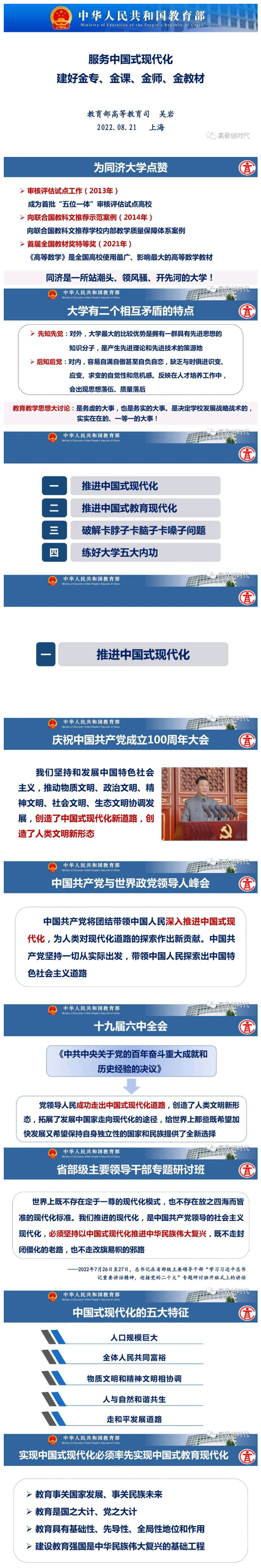 8月21日上午,在同济大学中层干部综合治理能力提升专题研讨班上,教育部高等教育司司长吴岩作题为“服务中国式现代化 建好金专、金课、金师、金教材”的主旨报告。